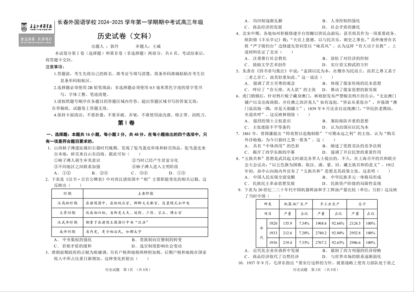 吉林省长春市外国语学校2025届高三上学期期中考试历史+答案