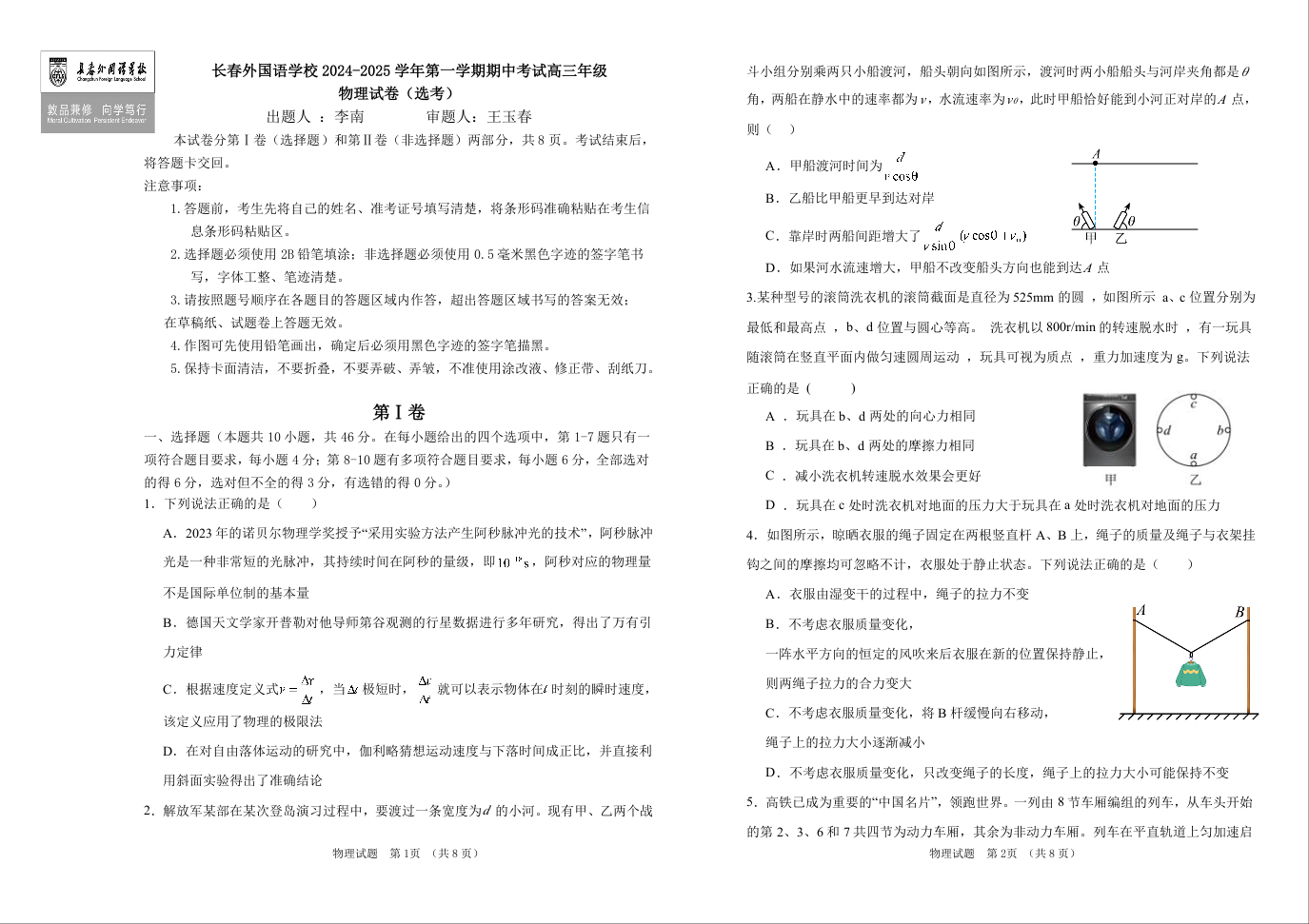 吉林省长春市外国语学校2025届高三上学期期中考试物理+答案