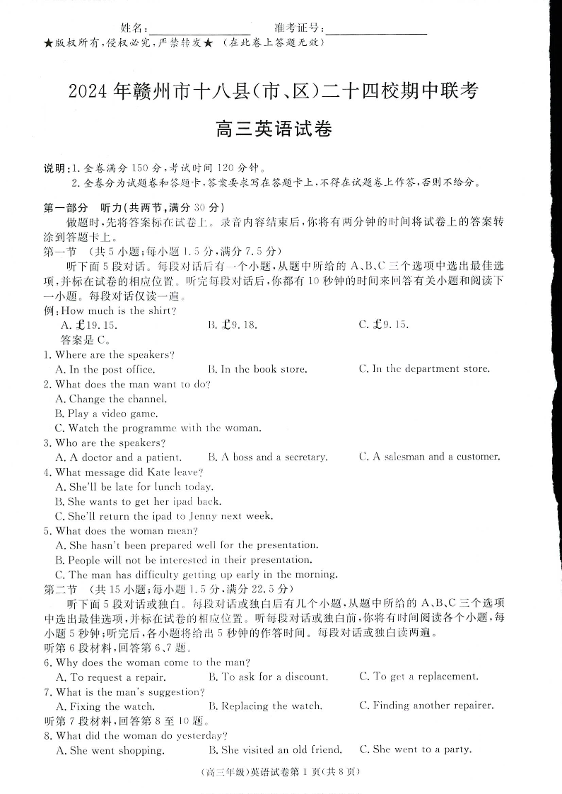江西省赣州市十八县(市、区)二十四校2025届高三上学期期中考试英语