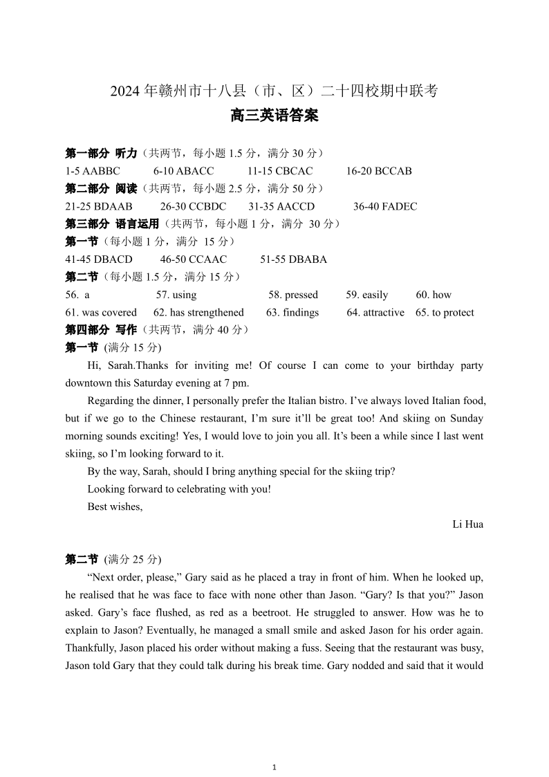 江西省赣州市十八县(市、区)二十四校2025届高三上学期期中考试英语答案