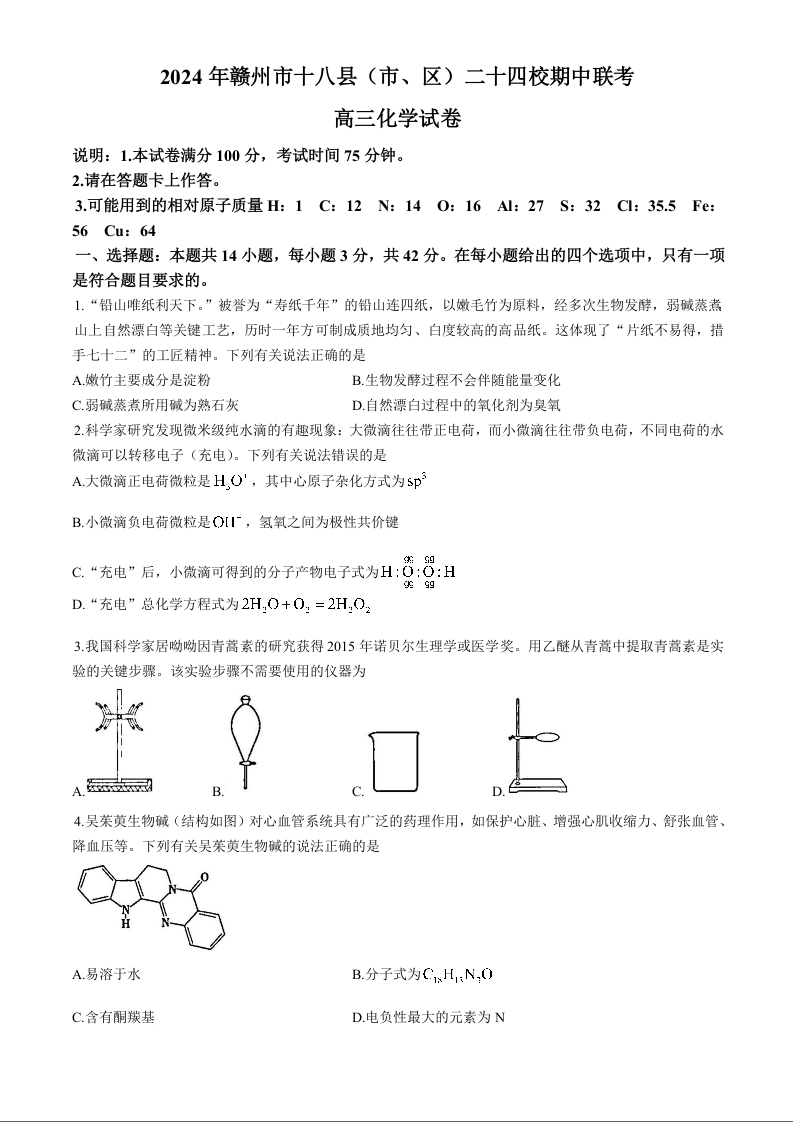 江西省赣州市十八县(市、区)二十四校2025届高三上学期期中考试化学+答案