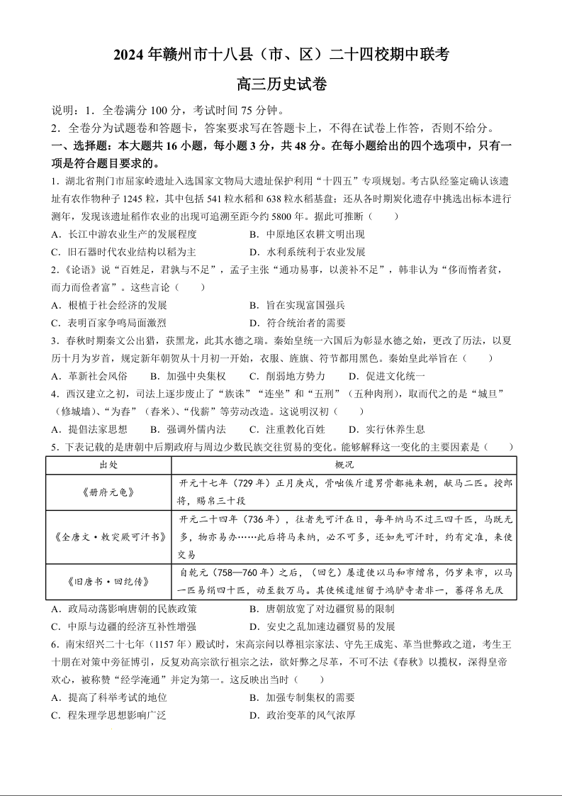 江西省赣州市十八县(市、区)二十四校2025届高三上学期期中考试历史+答案