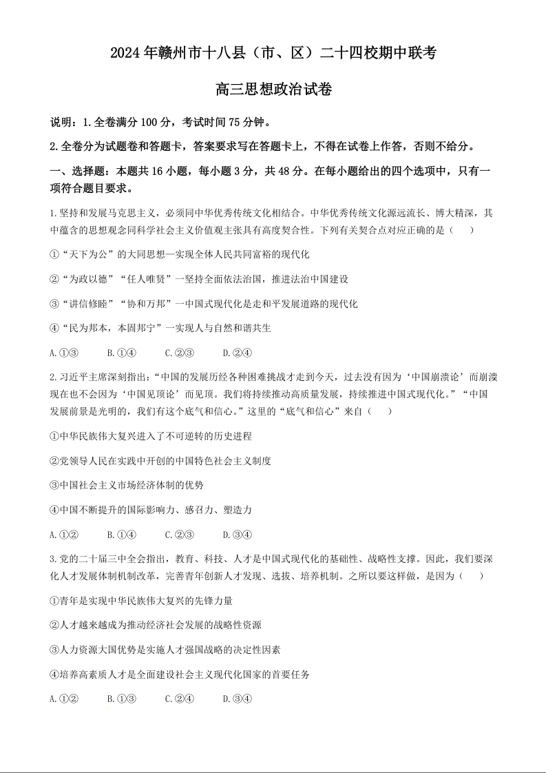 江西省赣州市十八县(市、区)二十四校2025届高三上学期期中考试政治+答案