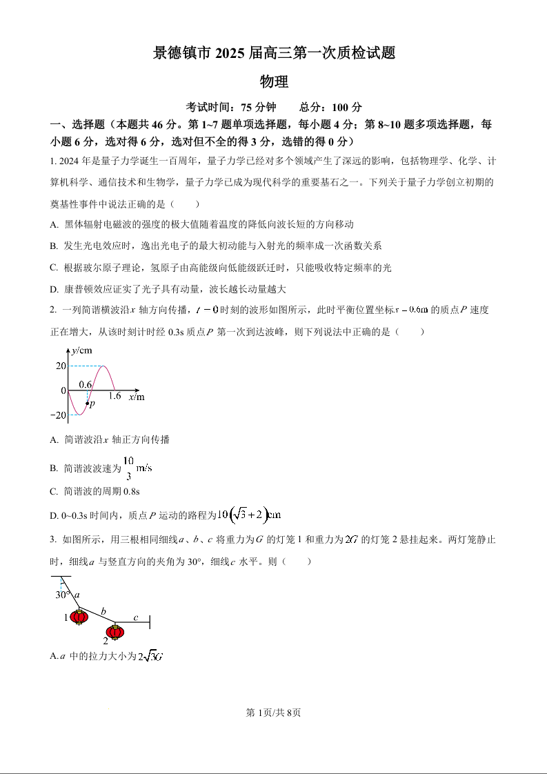 江西省景德镇市2025届高三第一次质量检测物理(原卷版)