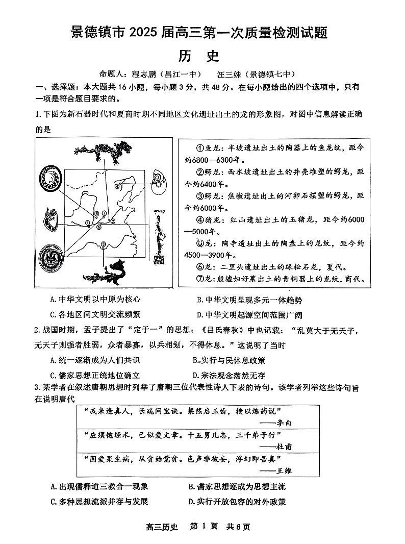 江西省景德镇市2025届高三第一次质量检测历史+答案