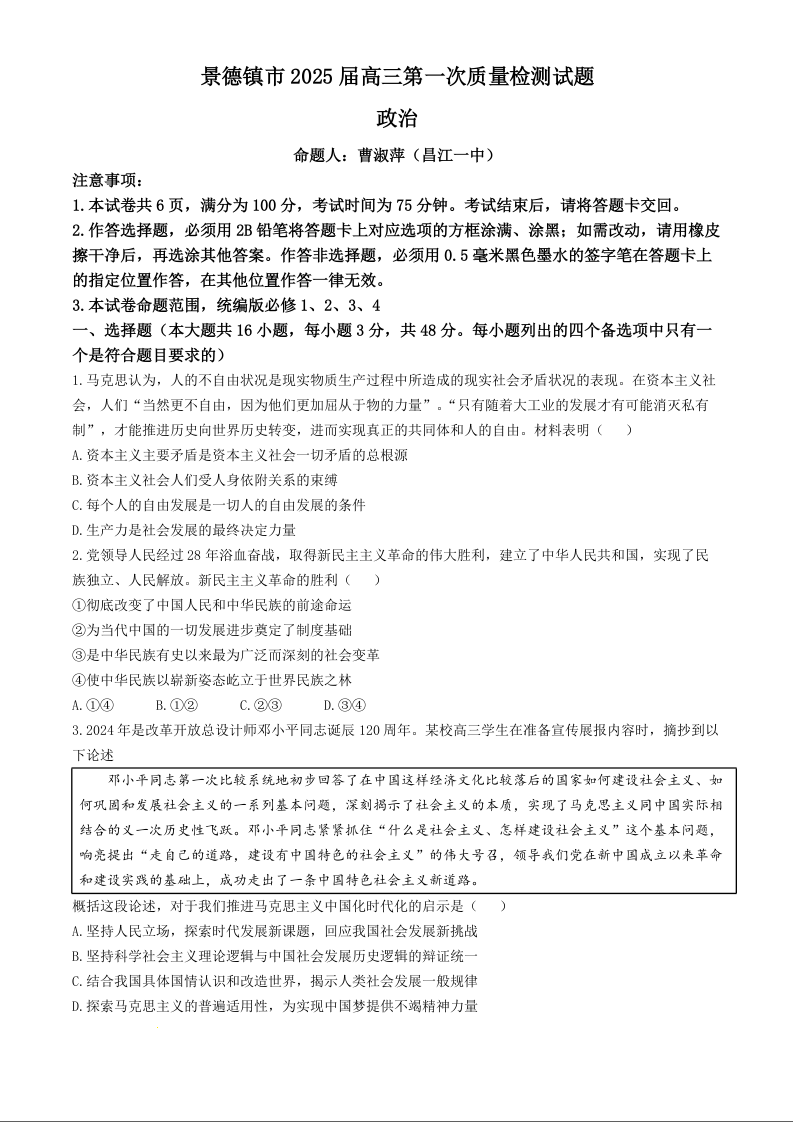 江西省景德镇市2025届高三第一次质量检测政治+答案