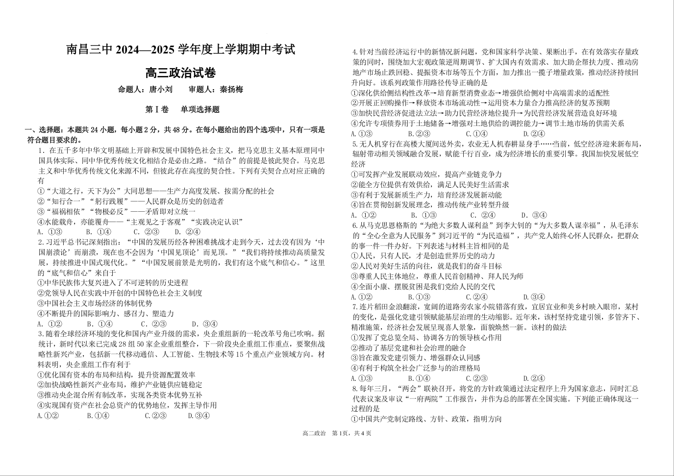 江西省南昌市第三中学2025届高三上学期11月期中考试政治+答案