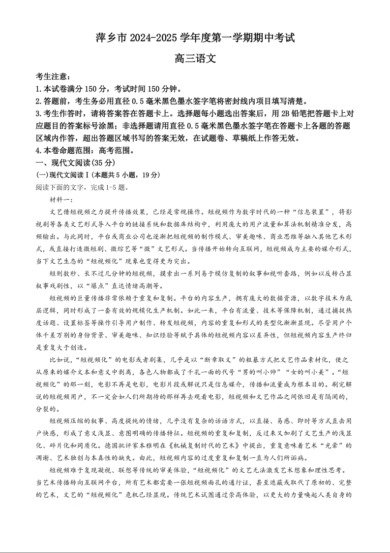 江西省萍乡市2025届高三上学期11月期中考试语文+答案