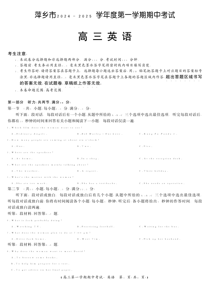 江西省萍乡市2025届高三上学期11月期中考试英语
