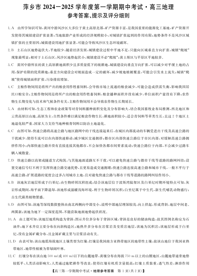 江西省萍乡市2025届高三上学期11月期中考试地理答案