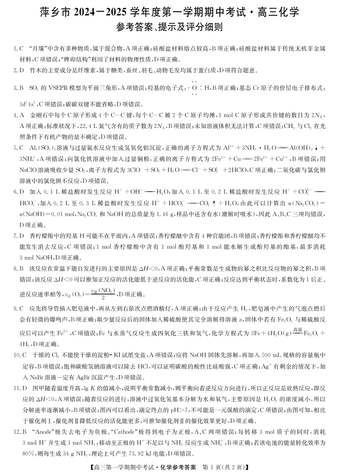 江西省萍乡市2025届高三上学期11月期中考试化学答案