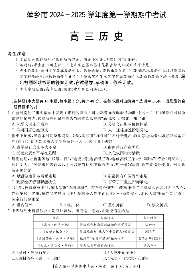 江西省萍乡市2025届高三上学期11月期中考试历史