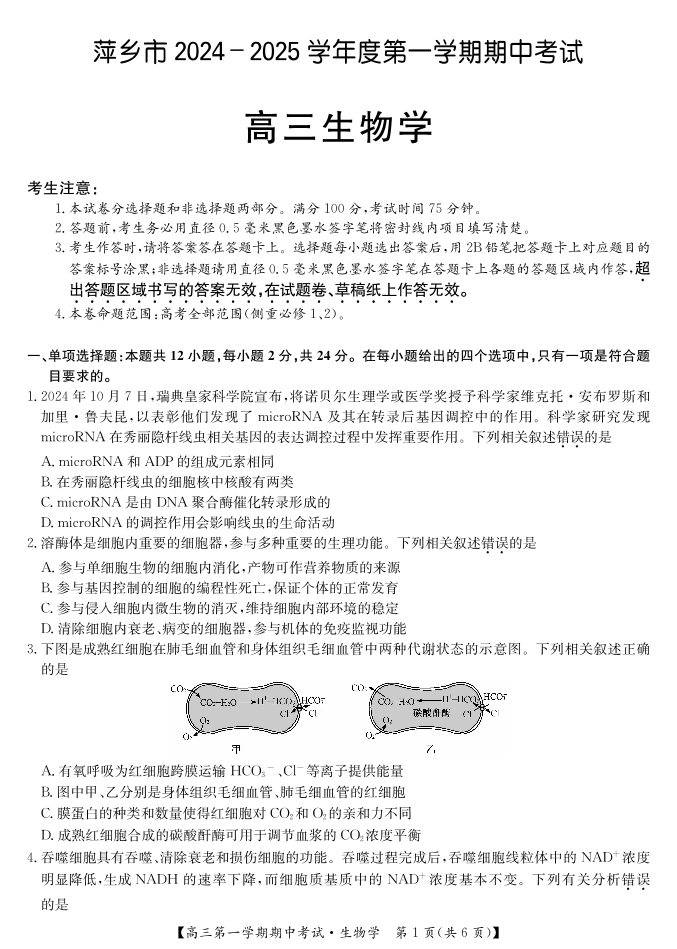 江西省萍乡市2025届高三上学期11月期中考试生物