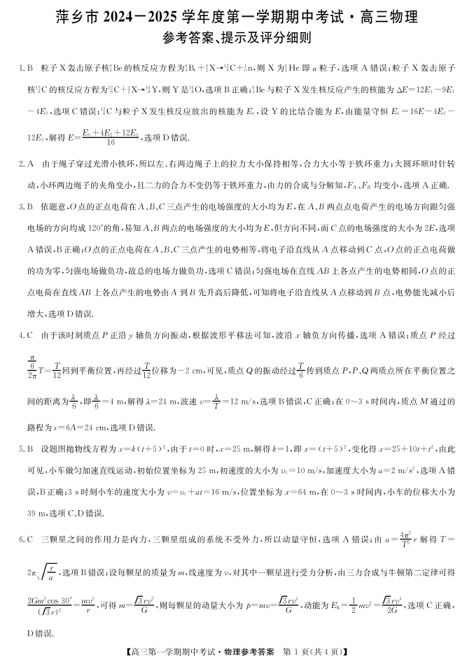 江西省萍乡市2025届高三上学期11月期中考试物理答案