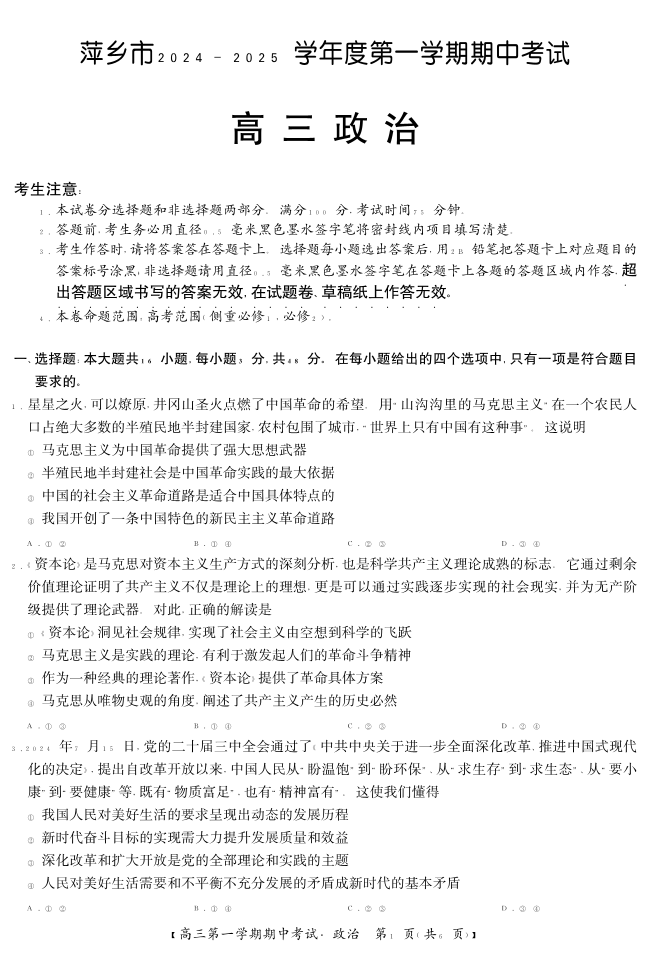 江西省萍乡市2025届高三上学期11月期中考试政治