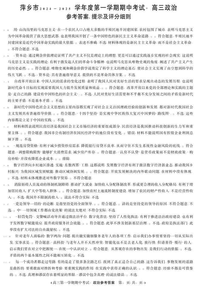 江西省萍乡市2025届高三上学期11月期中考试政治答案