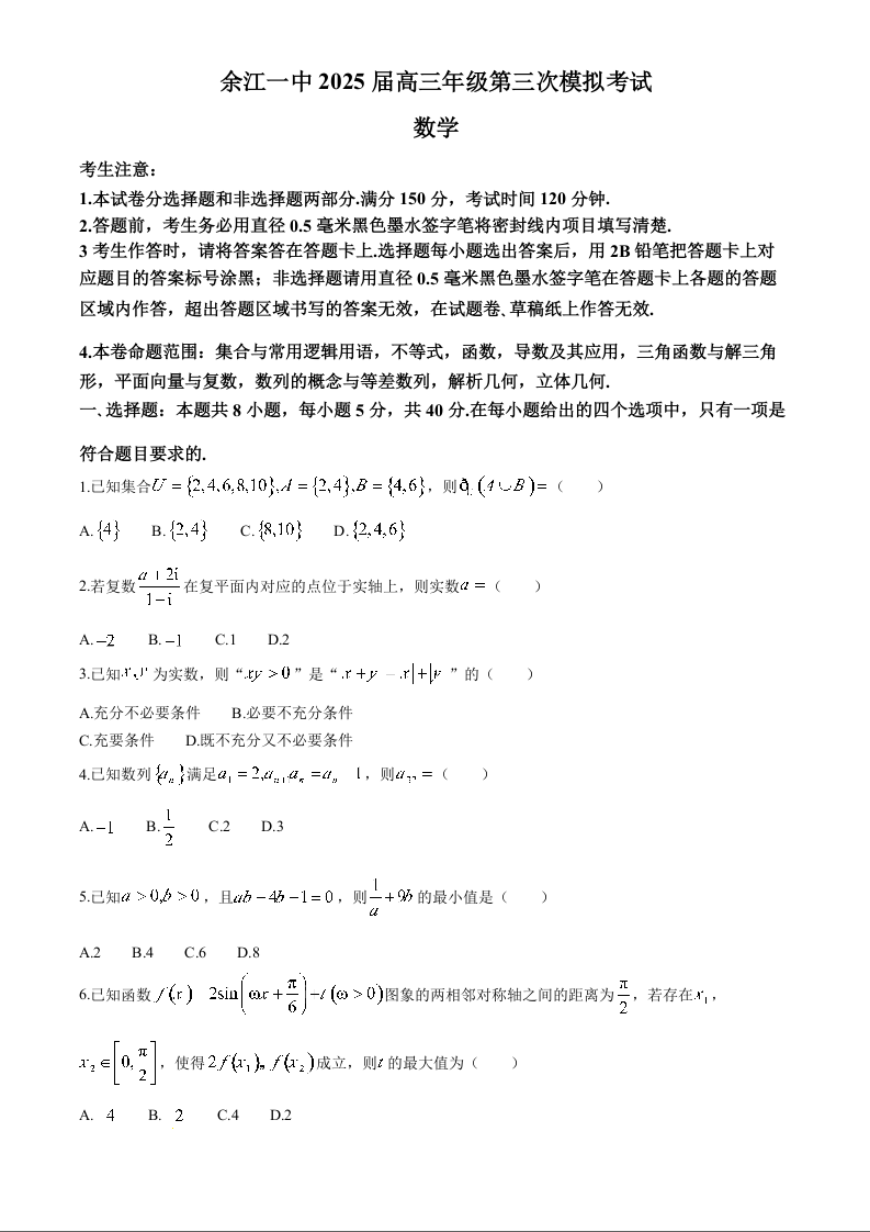 江西省鹰潭市余江区第一中学2025届高三上学期11月期中考试数学+答案