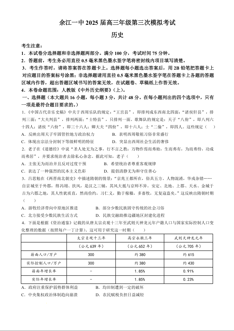 江西省鹰潭市余江区第一中学2025届高三上学期11月期中考试历史+答案