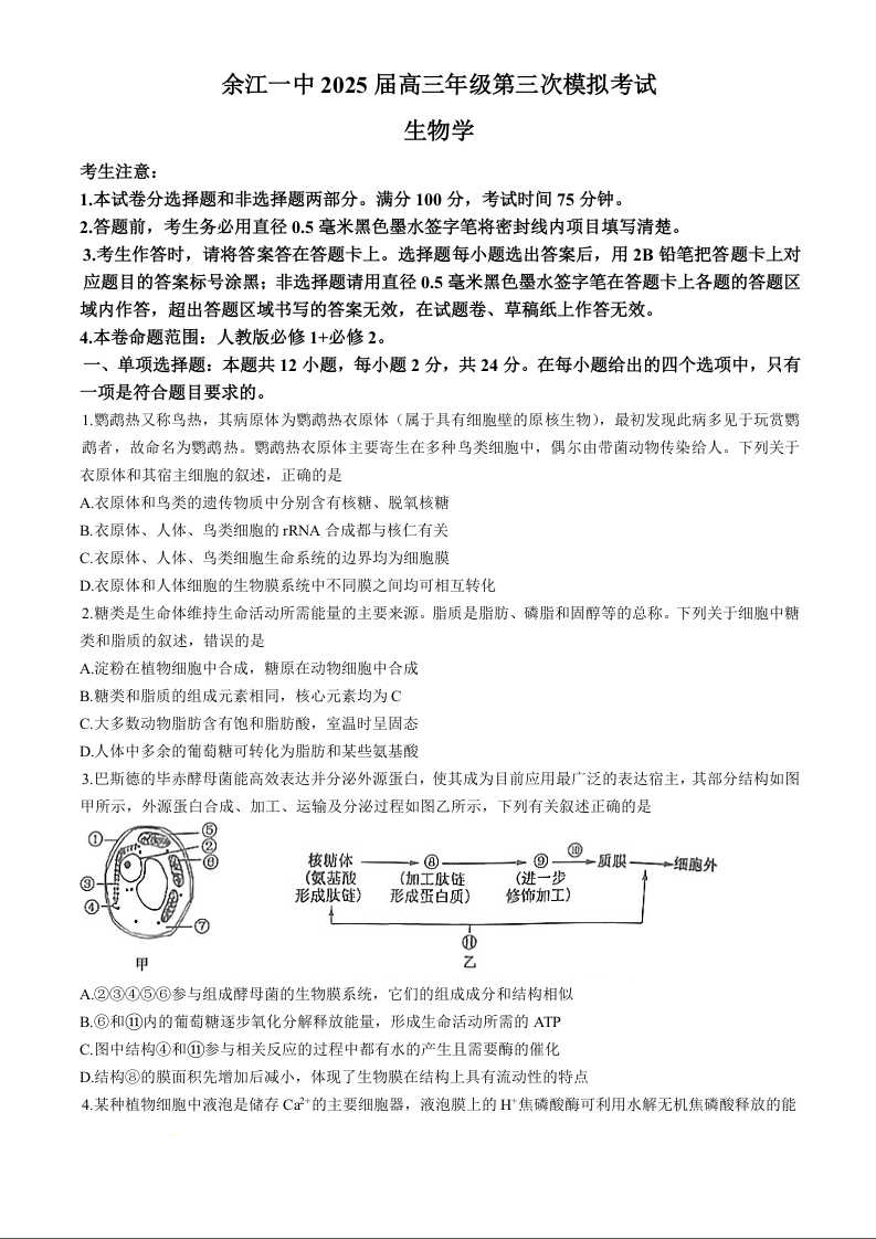江西省鹰潭市余江区第一中学2025届高三上学期11月期中考试生物+答案