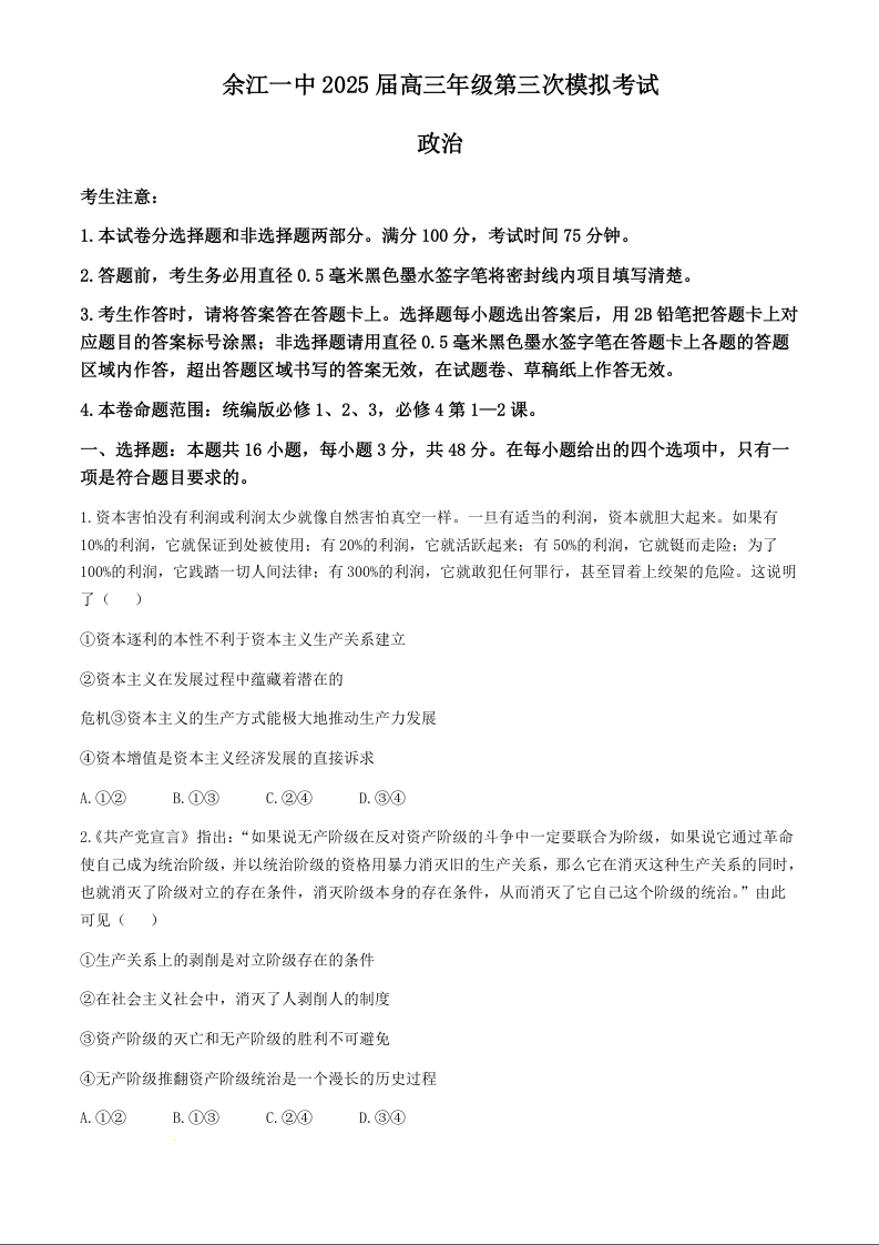 江西省鹰潭市余江区第一中学2025届高三上学期11月期中考试政治+答案