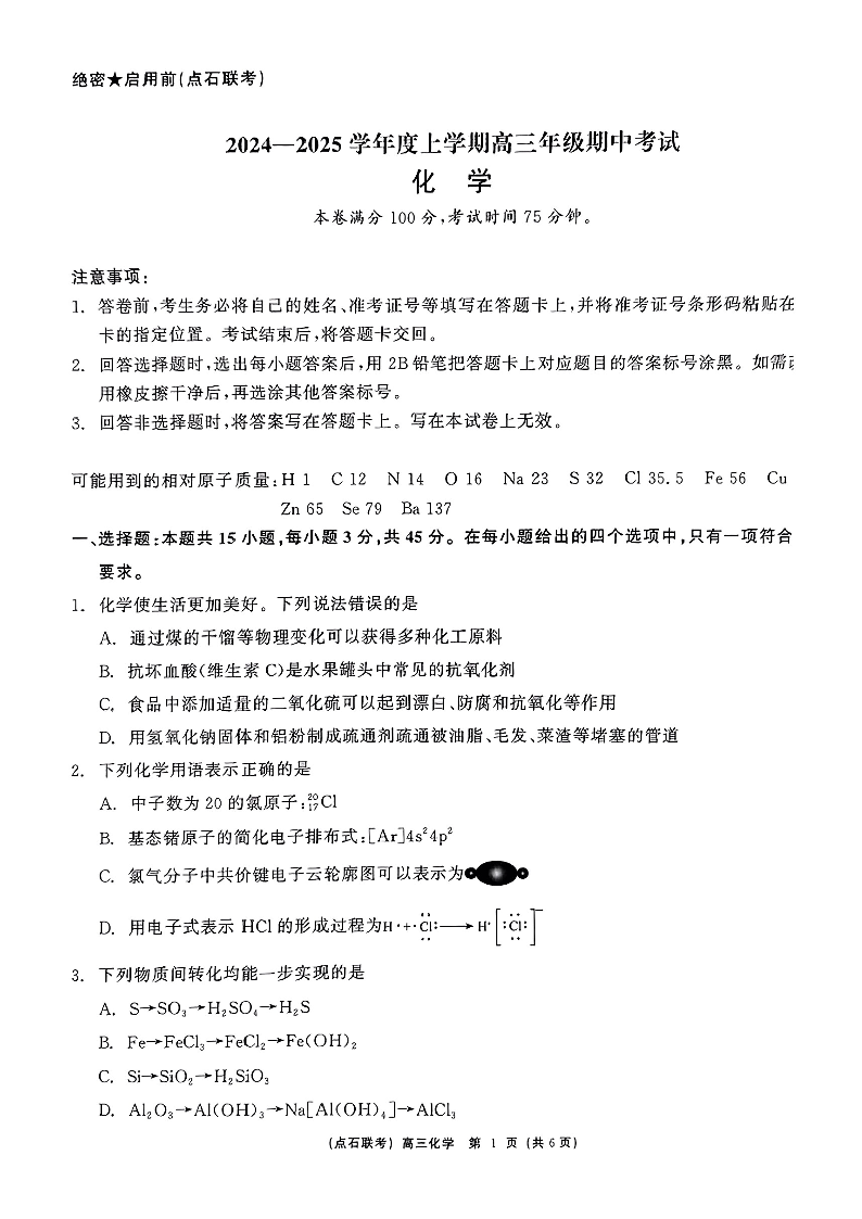 辽宁省点石联考(辽宁县级协作体)2025届上学期高三年级期中考试化学