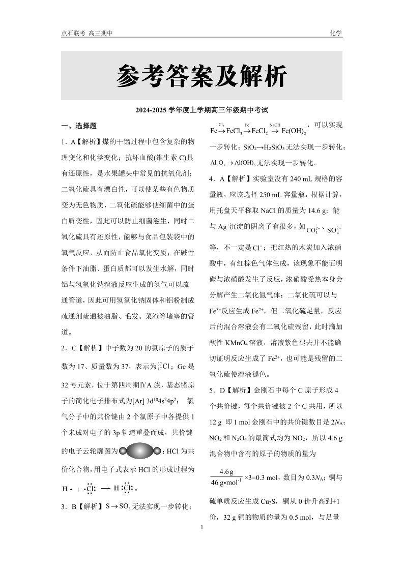 辽宁省点石联考(辽宁县级协作体)2025届上学期高三年级期中考试化学答案
