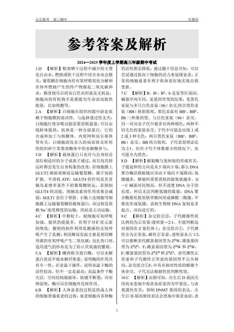 辽宁省点石联考(辽宁县级协作体)2025届上学期高三年级期中考试生物答案