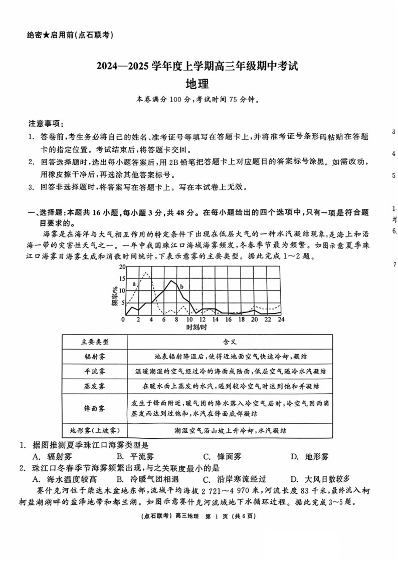 辽宁省点石联考(辽宁县级协作体)2025届上学期高三年级期中考试地理+答案