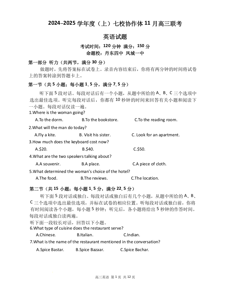 辽宁省七校协作体2025届高三上学期11月期中考试英语