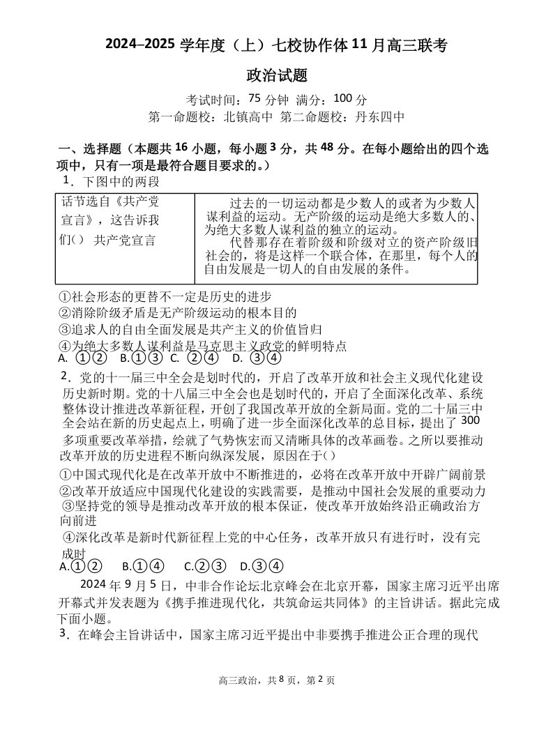 辽宁省七校协作体2025届高三上学期11月期中考试政治
