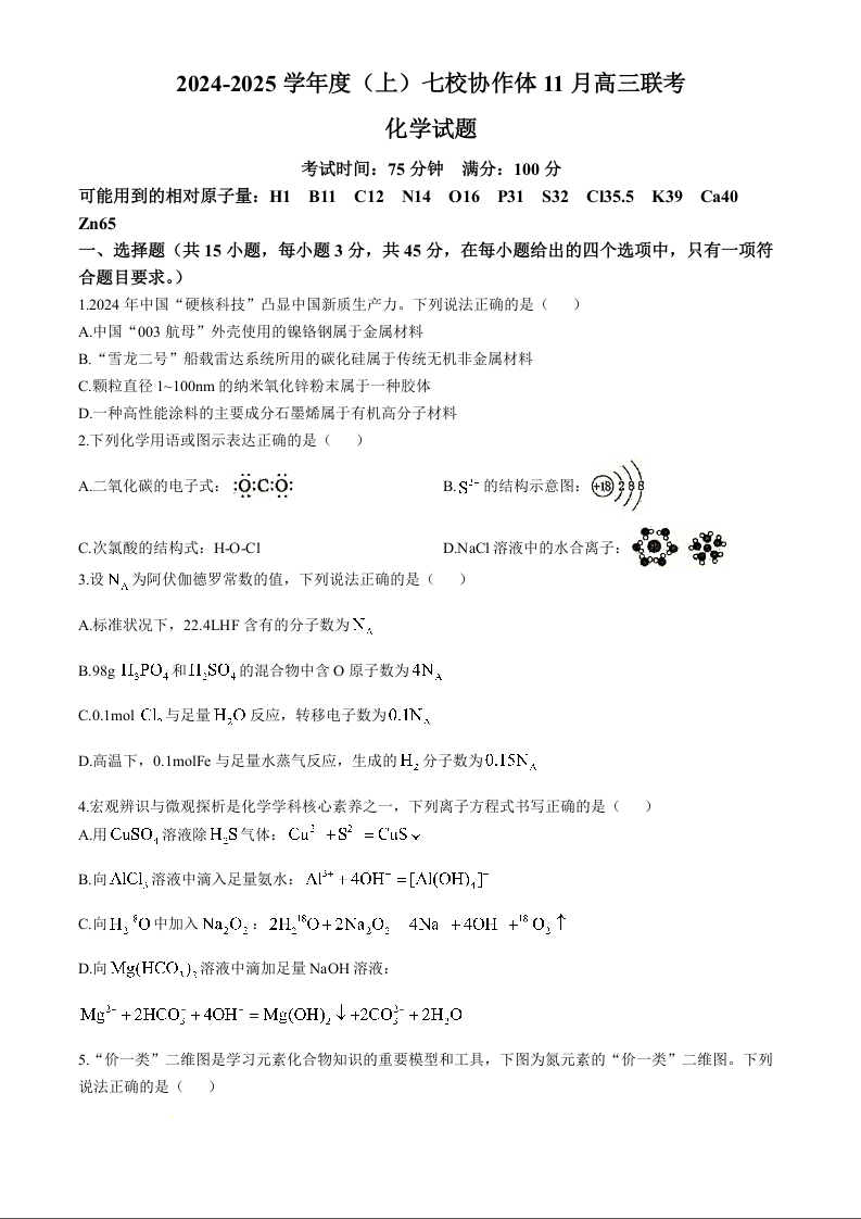 辽宁省七校协作体2025届高三上学期11月期中考试化学+答案