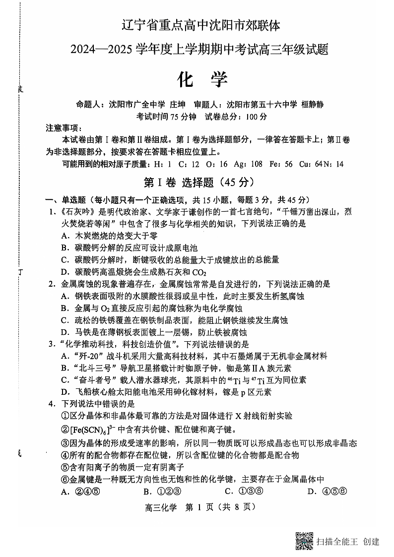 辽宁省沈阳市郊联体2025届上学期11月期中期中考试化学+答案