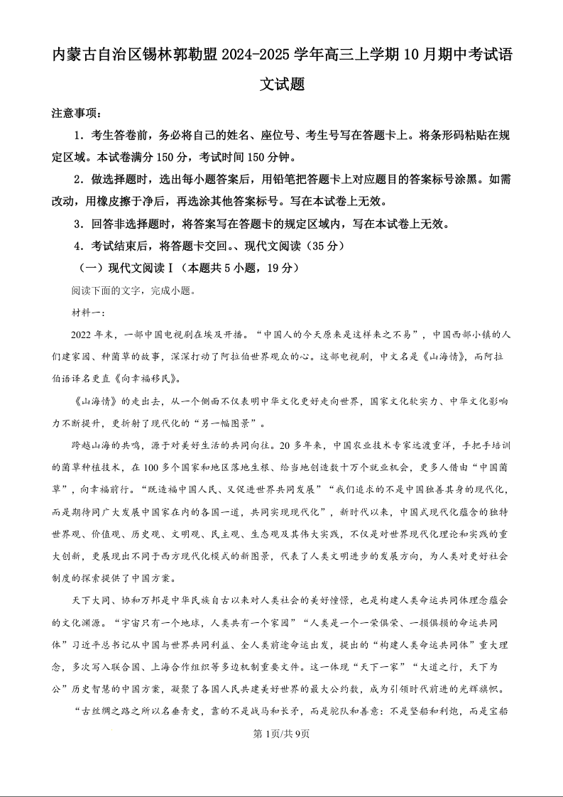 内蒙古自治区锡林郭勒盟2025届高三上学期11月期中考试语文(原卷版)