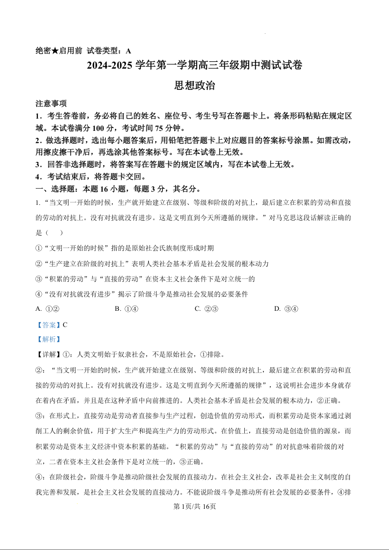 内蒙古自治区锡林郭勒盟2025届高三上学期11月期中考试政治(精品解析版)