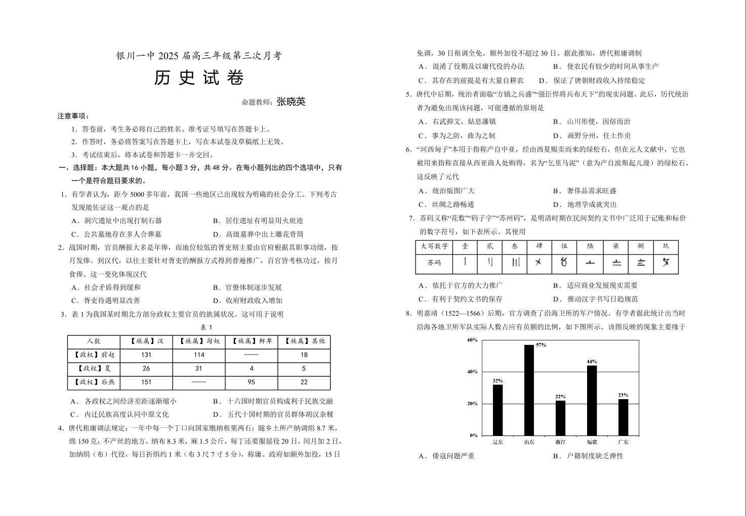 宁夏回族自治区银川一中2025届高三上学期第三次月考历史+答案