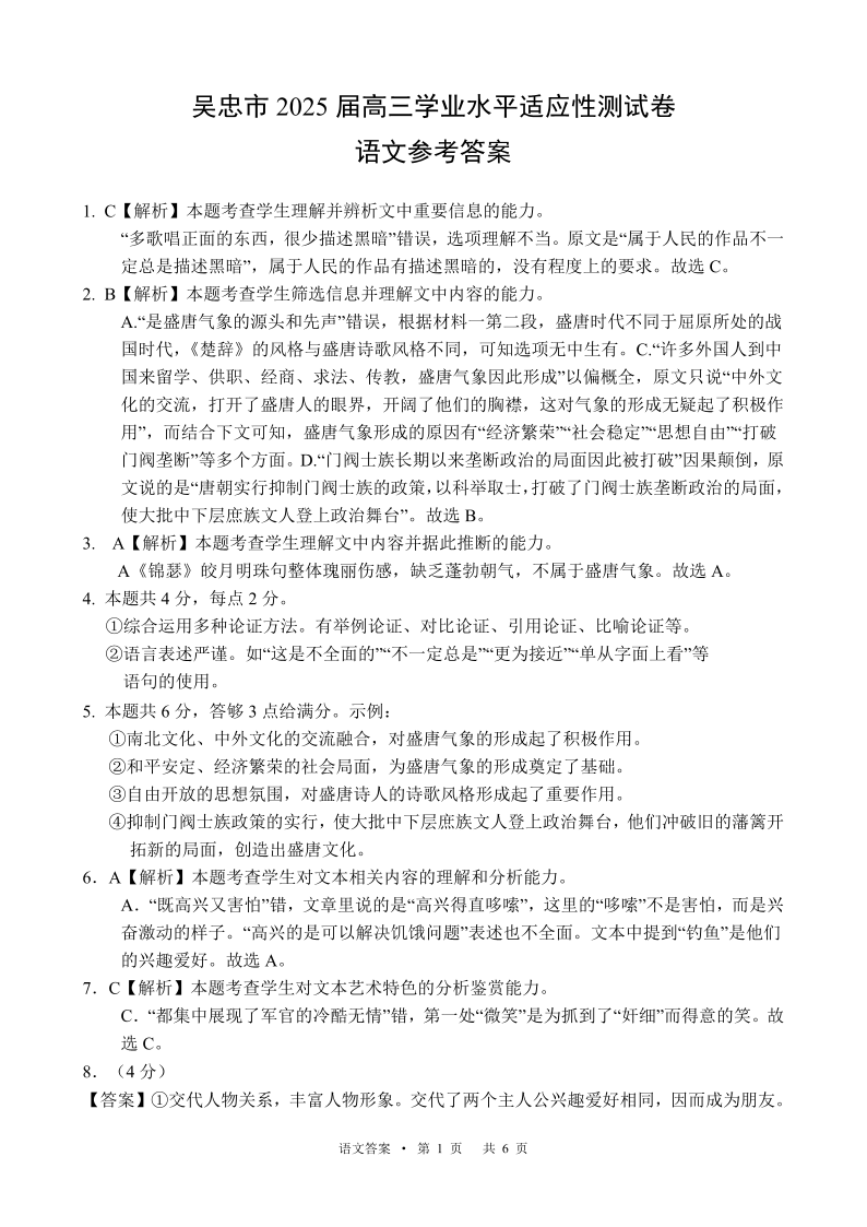 宁夏回族自治区吴忠市高三上学期11月学业水平适应性考试语文答案