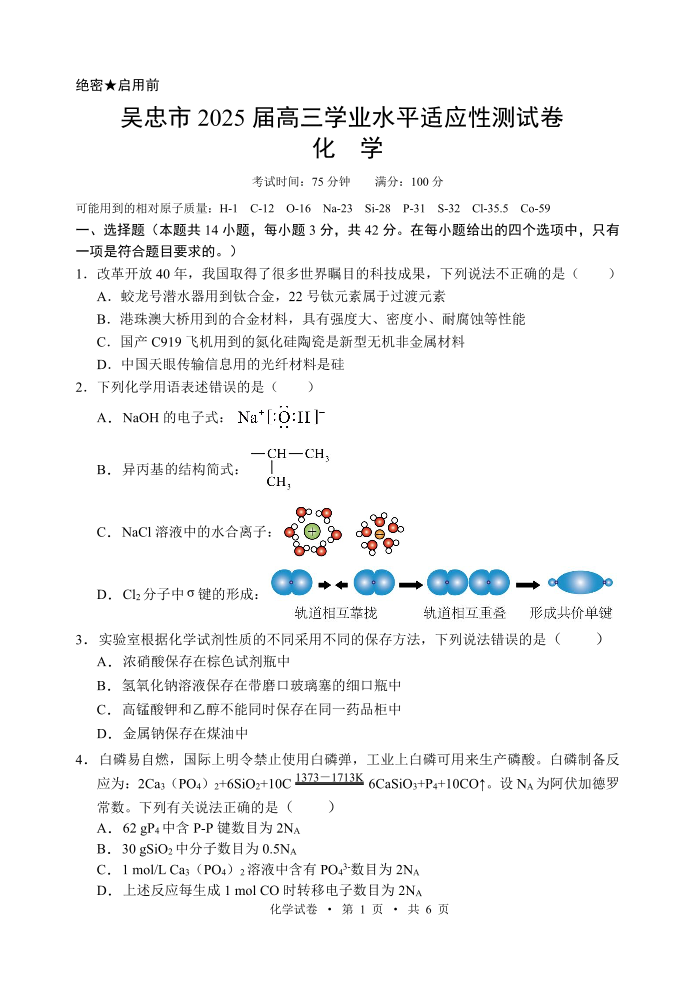 宁夏回族自治区吴忠市高三上学期11月学业水平适应性考试化学