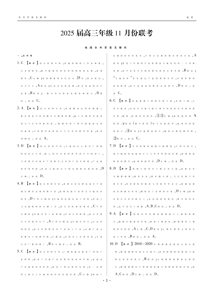 广东省区域高中2025届高三上学期11月大联考地理答案