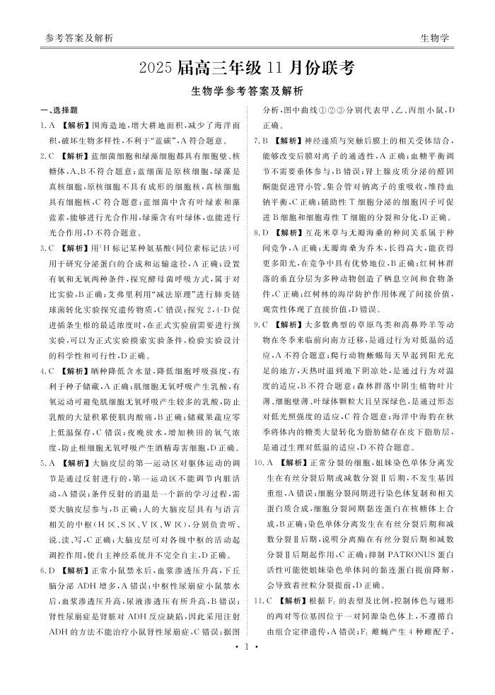 广东省区域高中2025届高三上学期11月大联考生物答案