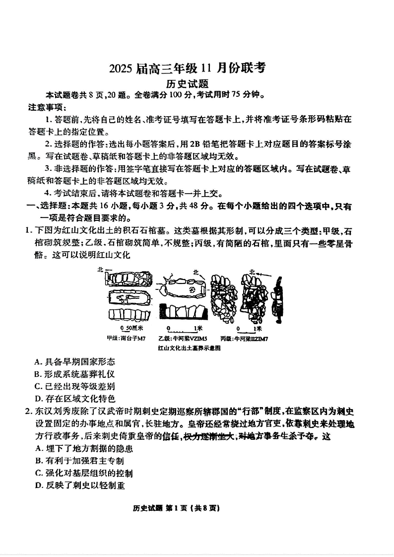 广东省区域高中2025届高三上学期11月大联考历史+答案