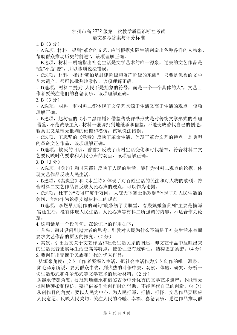 四川省泸州市高2022级第一次教学质量诊断性考试语文答案