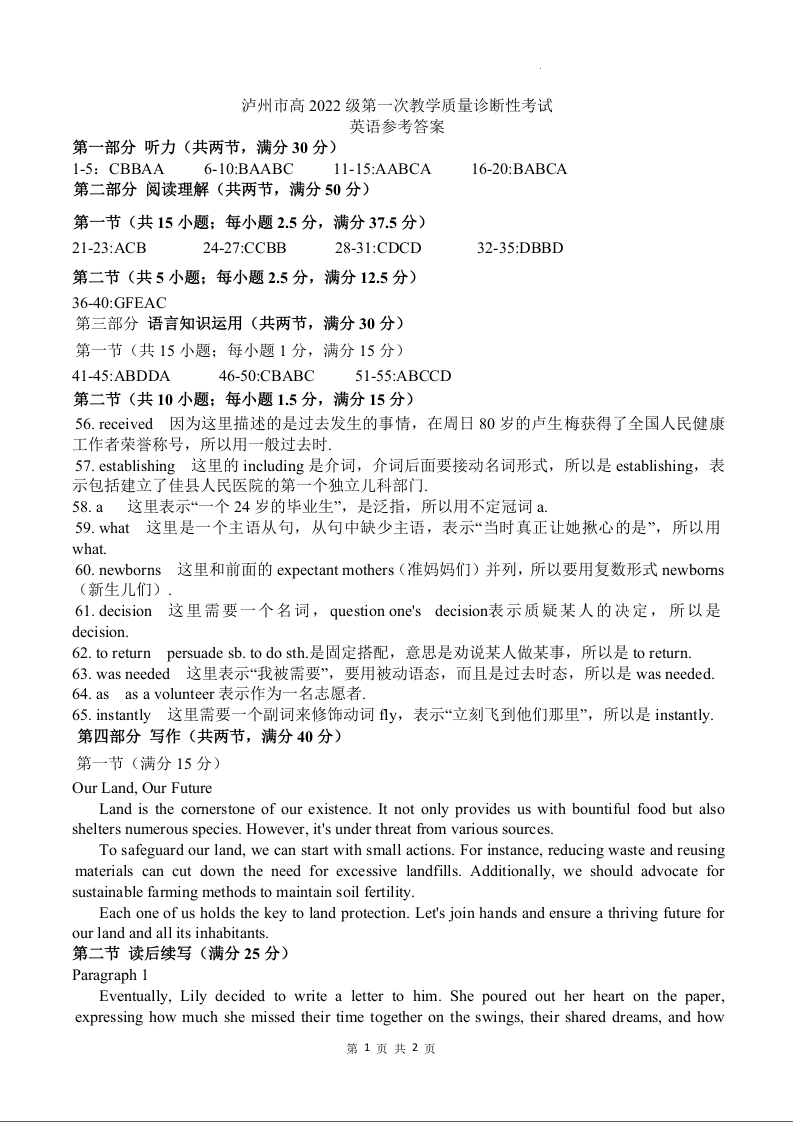 四川省泸州市高2022级第一次教学质量诊断性考试英语答案