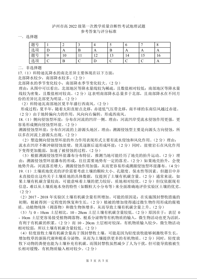 四川省泸州市高2022级第一次教学质量诊断性考试地理答案