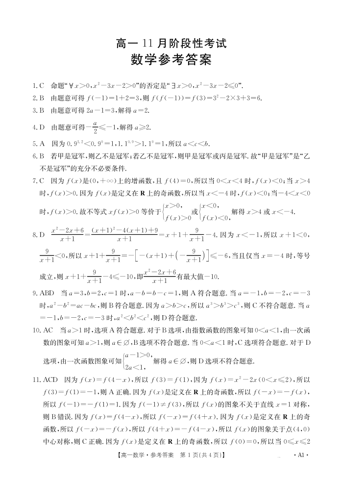 广西区域名校2024-2025学年高一上学期11月期中阶段性考试数学答案