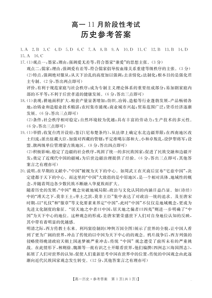 广西区域名校2024-2025学年高一上学期11月期中阶段性考试历史答案