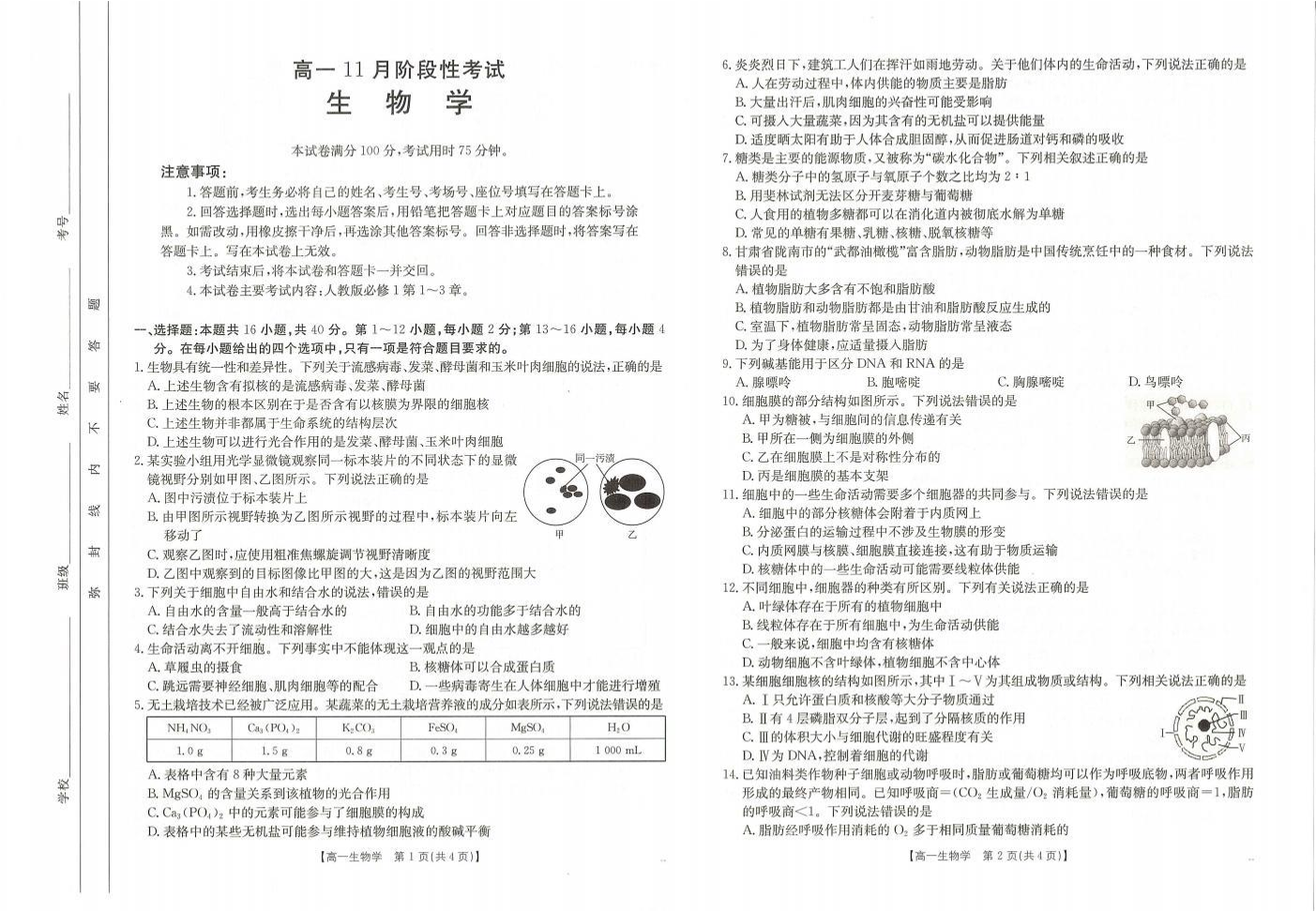 广西区域名校2024-2025学年高一上学期11月期中阶段性考试生物