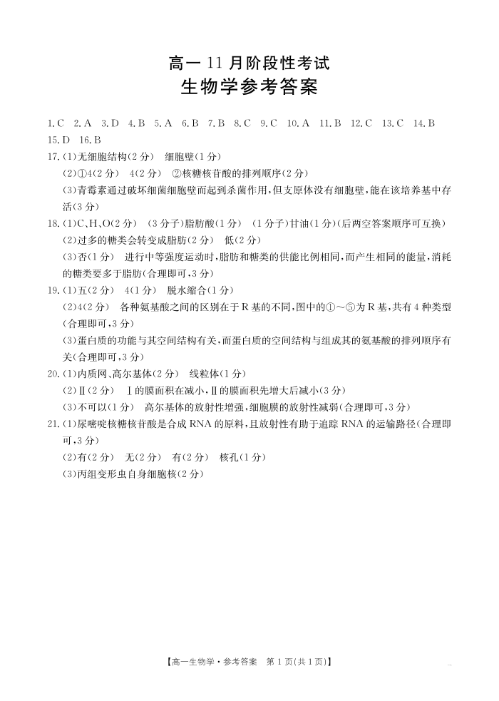 广西区域名校2024-2025学年高一上学期11月期中阶段性考试生物答案