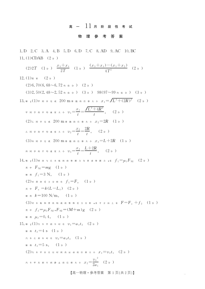 广西区域名校2024-2025学年高一上学期11月期中阶段性考试物理答案