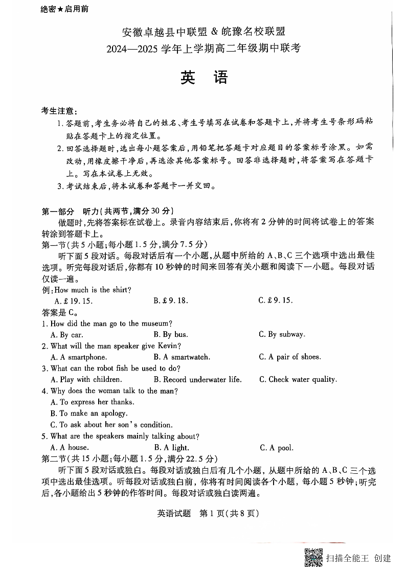 安徽省卓越县中联盟皖豫名校联盟2024-2025学年上学期高二期中联考英语