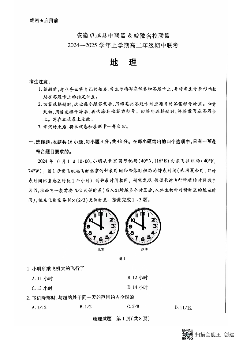 安徽省卓越县中联盟皖豫名校联盟2024-2025学年上学期高二期中联考地理